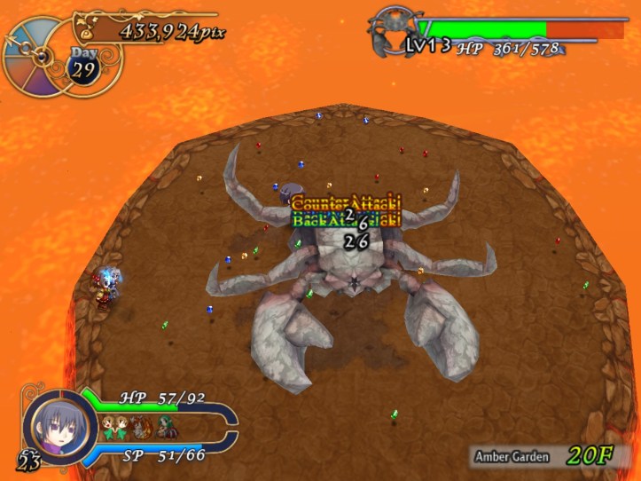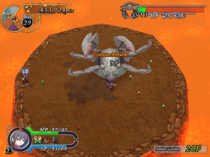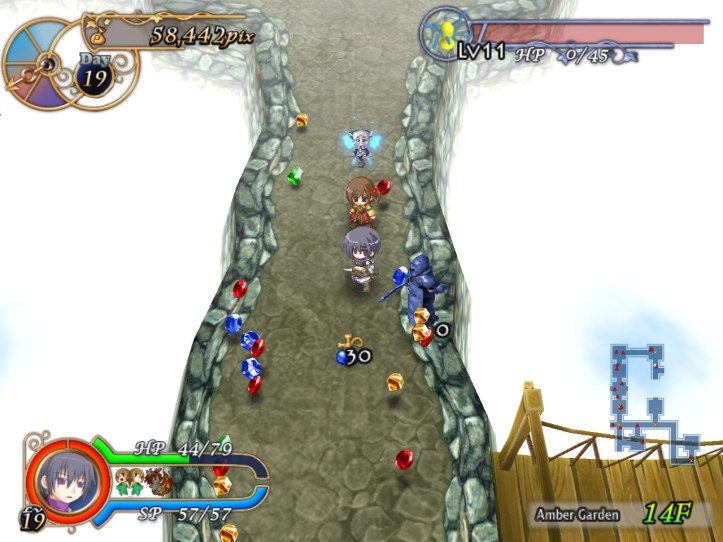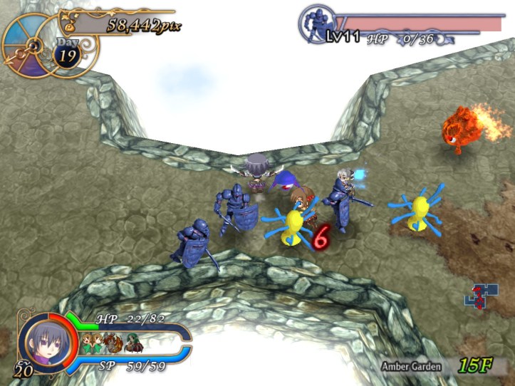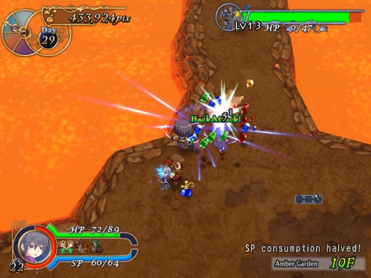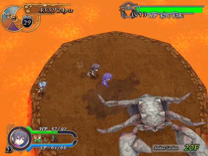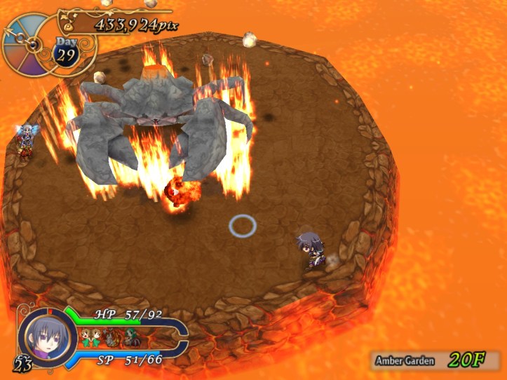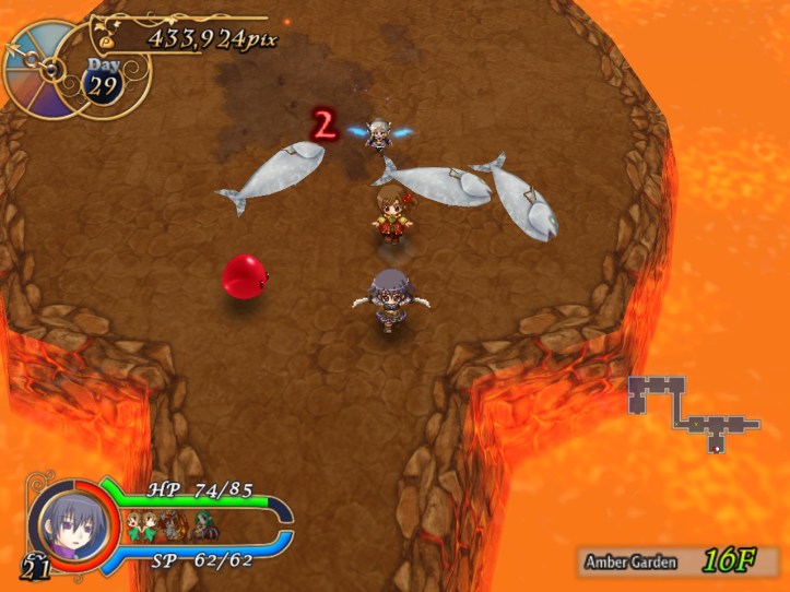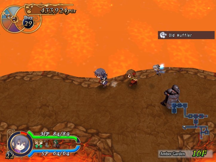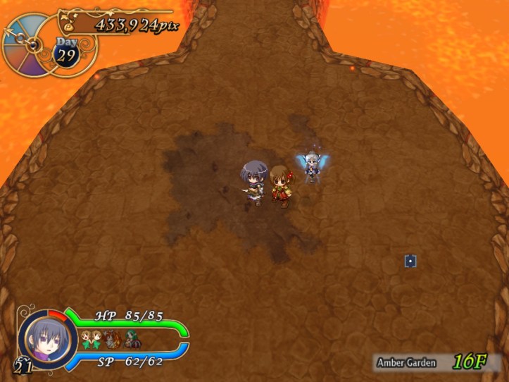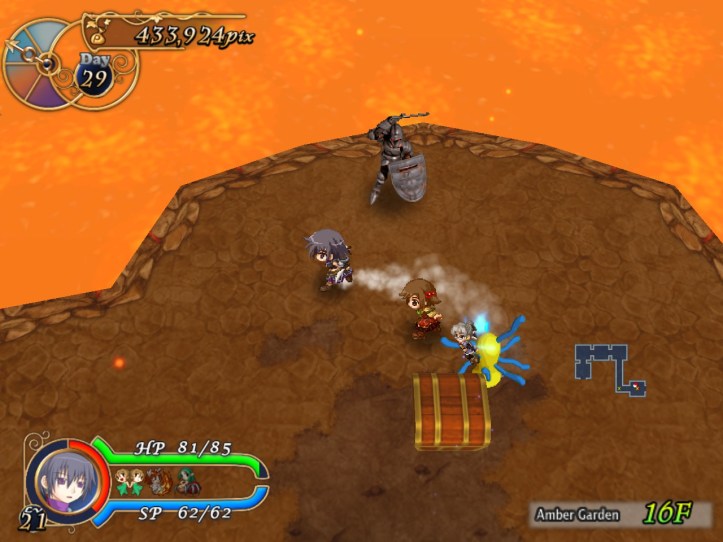 This floor’s all lava-like, and the music sounds like something out of a Mario lava level to boot. It’s all a bit concerning. New enemies include a metallic knight, though the blue one still shows up; I think I must have decent equipment on Charme this time, because even the newer types don’t seem to be doing too much damage.