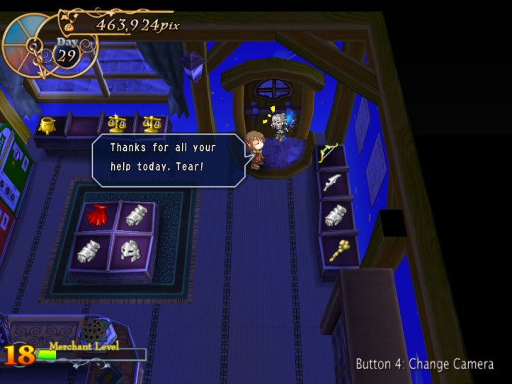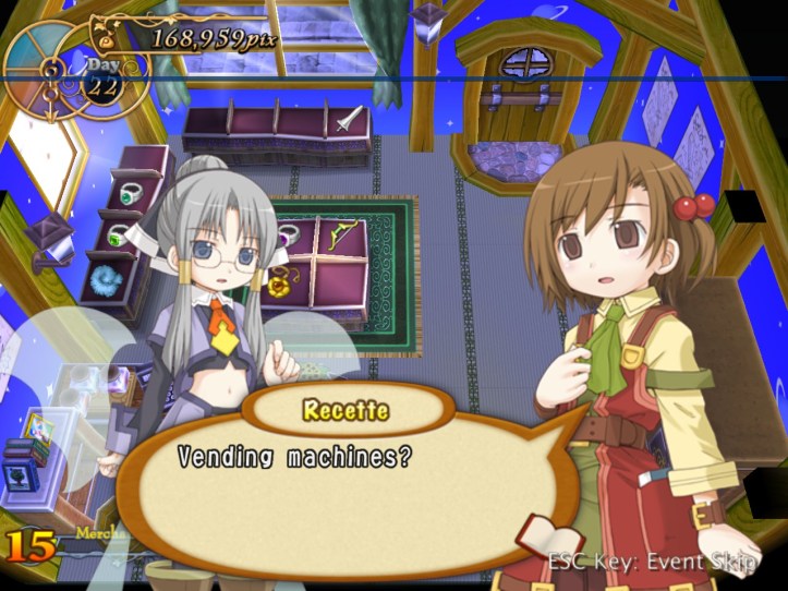 Well, that was a weird boom, but I’m happy about it! I’m now level 15 and with a fairly decent pix buffer for when Tear takes all my money away… Speaking of our fairy friend, she decides it’s time for us to learn about vending machines! Wahoo!