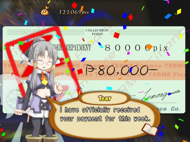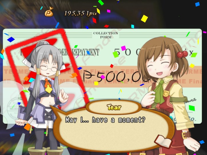 Tear recommends that we check the pause menu to see how much we owe, because she’d rather not tell us herself in case we have a heart attack or something.