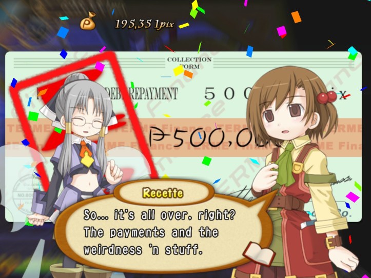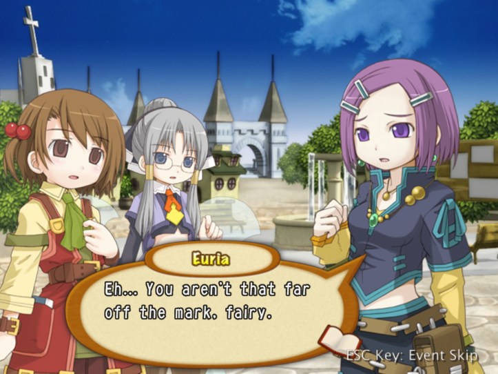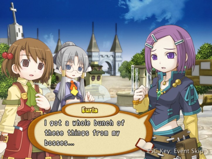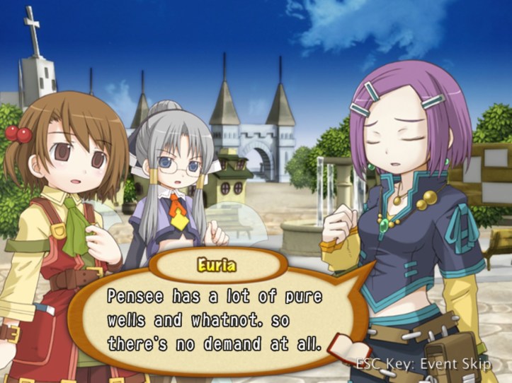 Not only are they not particularly desirable, but the town this game’s set in actually already has pure water everywhere. I almost feel sorry for Euria, except I really don’t. She can come work for us if she wants a legit job (I’m not paying her, though). Recette tells Euria that she can’t give up; Recette may not do things the same way Euria does, but she respects her tenacity.