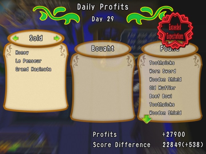 We’ve only got two more days, and thanks to some unwise spending I still have a bit of a way to go… People are still buying pretty nicely, though; Charme picks up a sandwich board which can be used as armour, so I guess next time I take her down to the dungeon she’ll be doubling as a Subway advert.