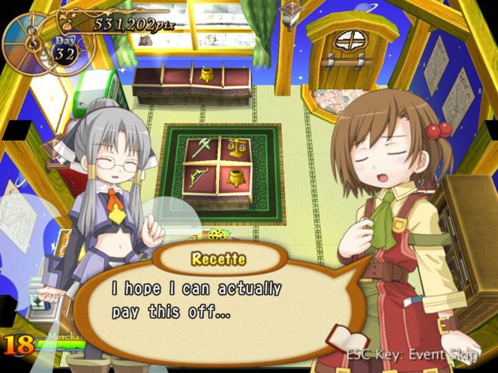 Back to the shop, and I’m still doing pretty well. My strategy now is something along the lines of: always have a few of every type of item; put out nothing but high-price stuff if possible; keep the vending machine stocked with low-to-mid-price stuff; sell at reasonable markups that customers should take first time to get the combos and so people will like me more and want to spend more. It seems to be working! We’ll definitely be alright this week, at any rate. Just depends what the payment goes up to next time…