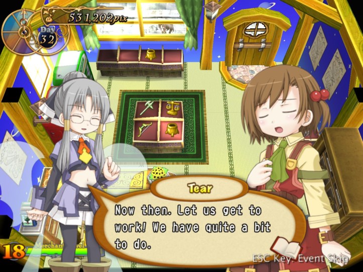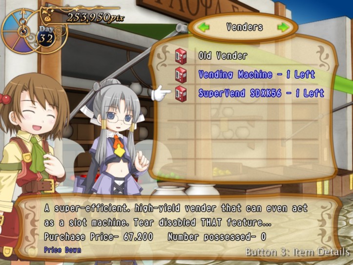 Okay, Tear suggests cheaper items are probably the sensible choice for vending, and I can see her logic for sure. Maybe if an item’s gone blue (meaning the price is down) I can stick it in the vending machine and it might still sell for base price, whereas people would only pay around 50 – 60% if they were trying to get it from me. Tear also lets us know that nobody wants to buy vending machines, so we can only get rid of one by selling it to the Merchants’ Guild at a loss.