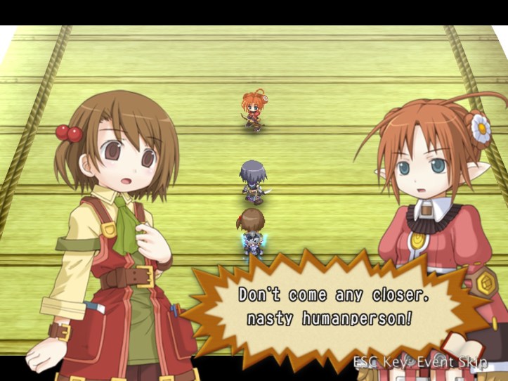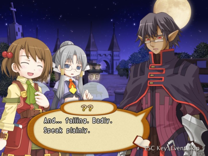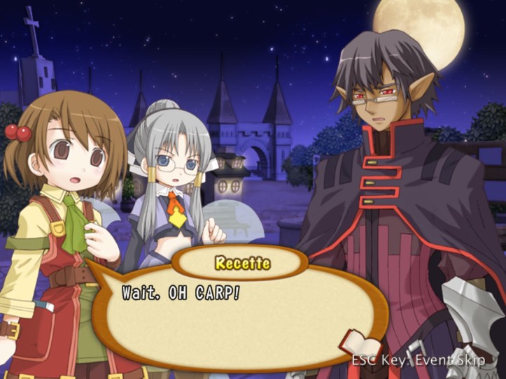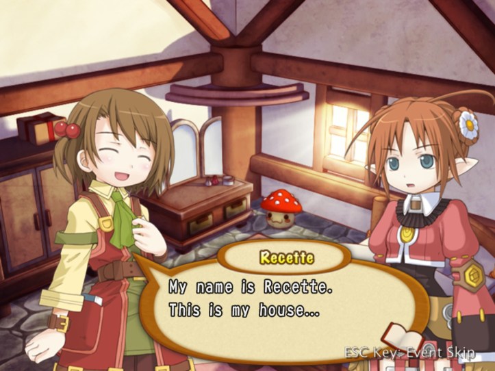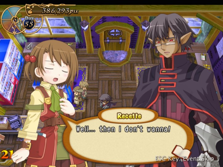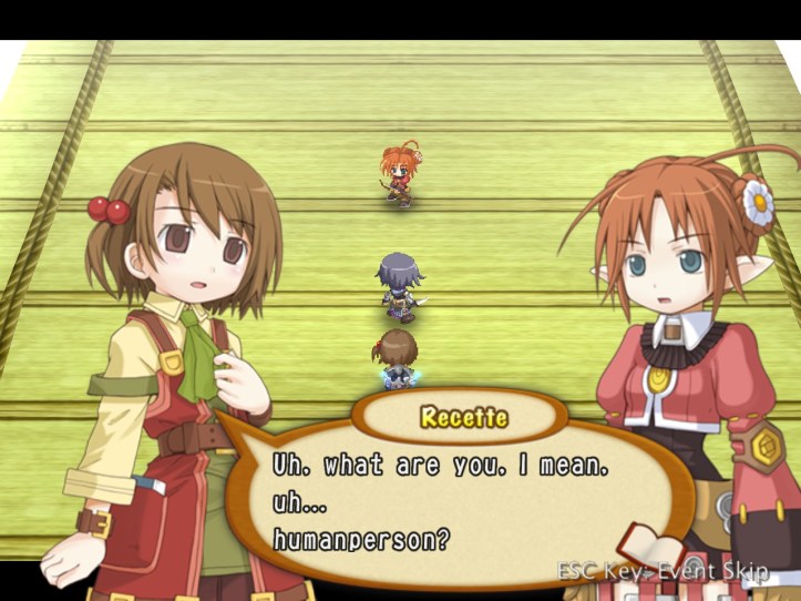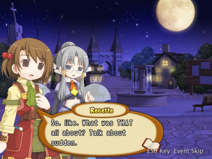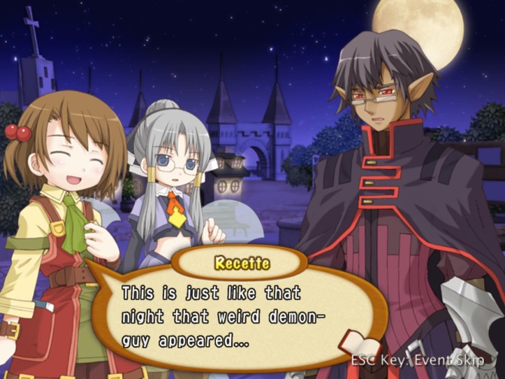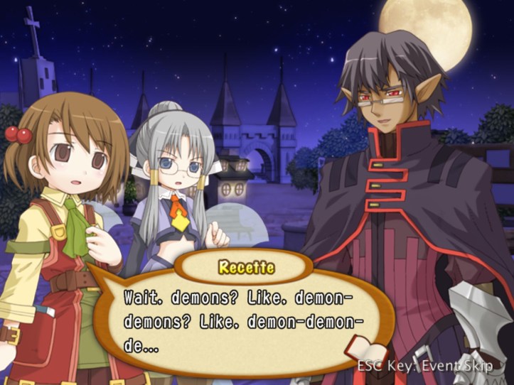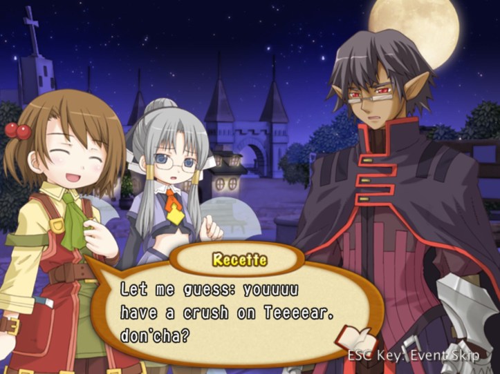 Well, that’s… really sad! I wonder whether we’ve met any of these humans-turned-fairies (doubt it, though, as Tear and Prime are the only two we know). Demon Dude goes on to talk about how he hates humans even more than fairies on account of the whole ‘we’re humans so we’re best’ mentality. Warning: dialogue slideshow in which Recette is adorable incoming.