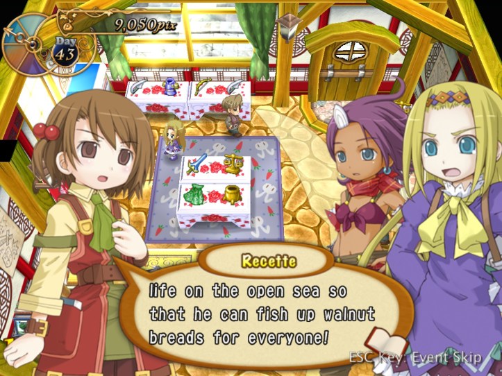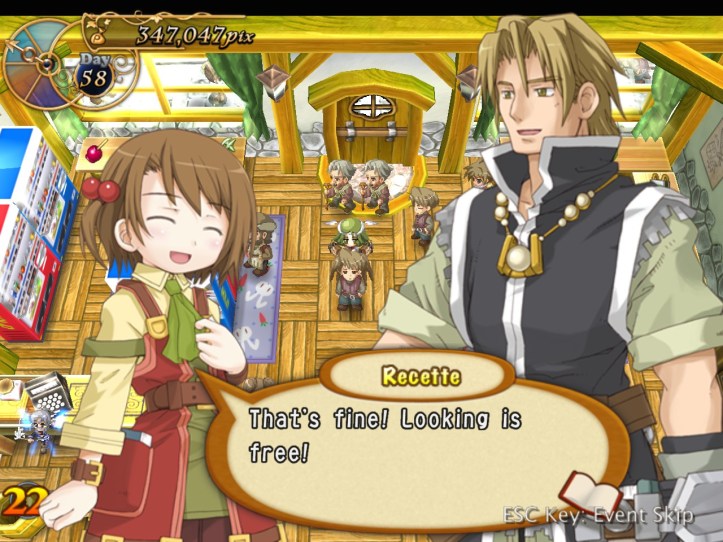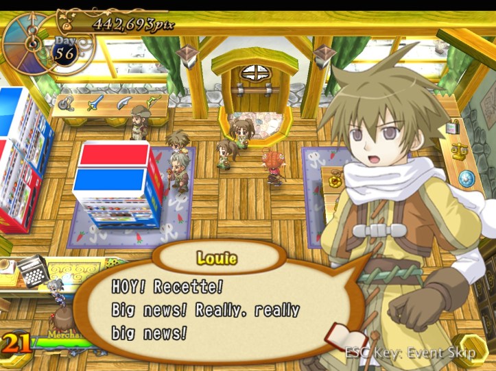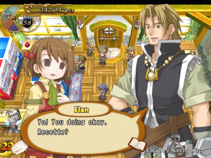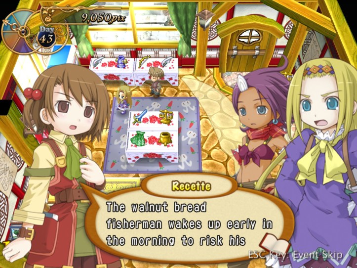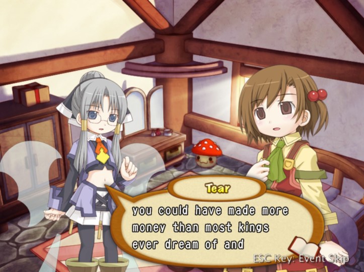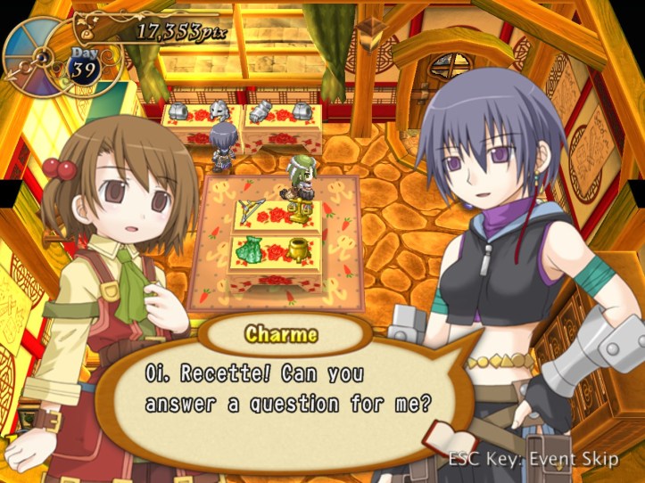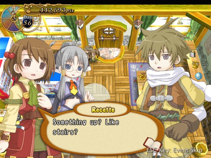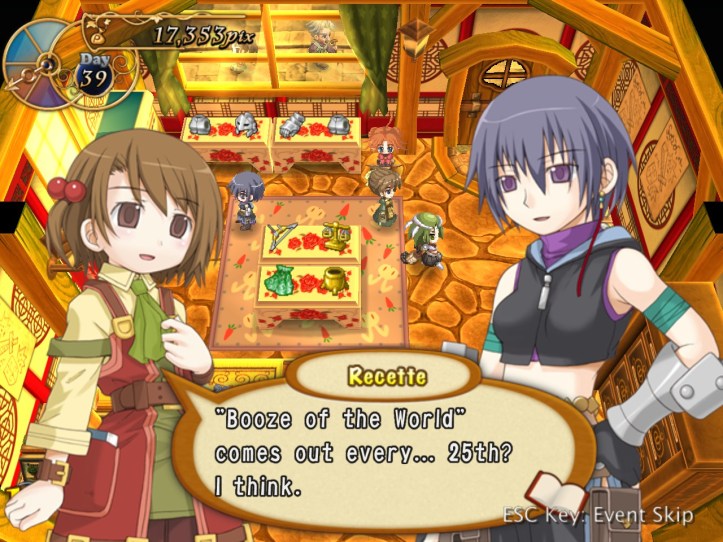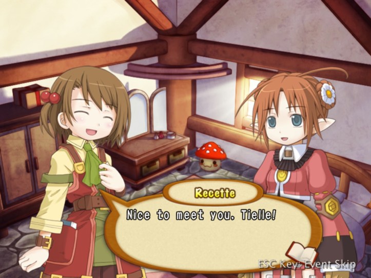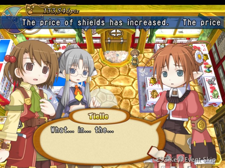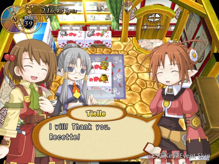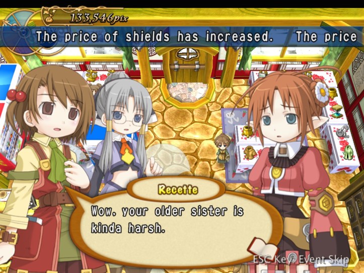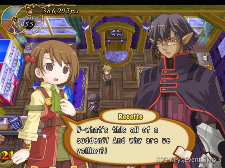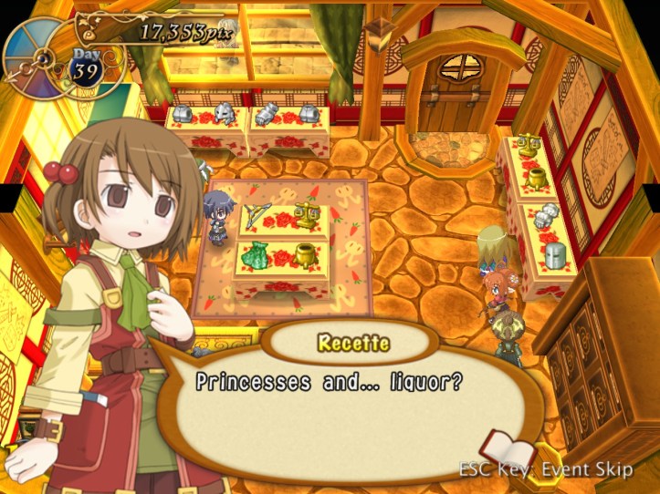Just as Tielle scoots, Alouette pops into the store and tells us about a coup in a nearby kingdom, which Recette doesn’t care about at all, but apparently there’s a missing princess or something. I was wondering if it might be Tielle, but then Alouette mentions the kingdom being famous for its drink…