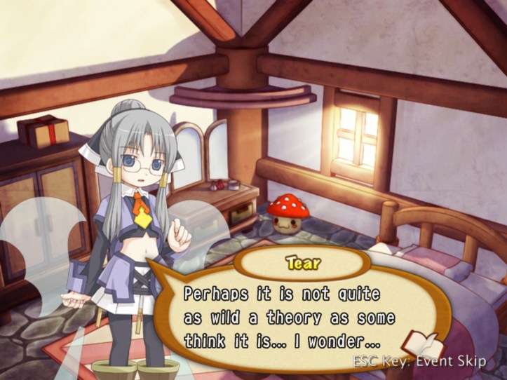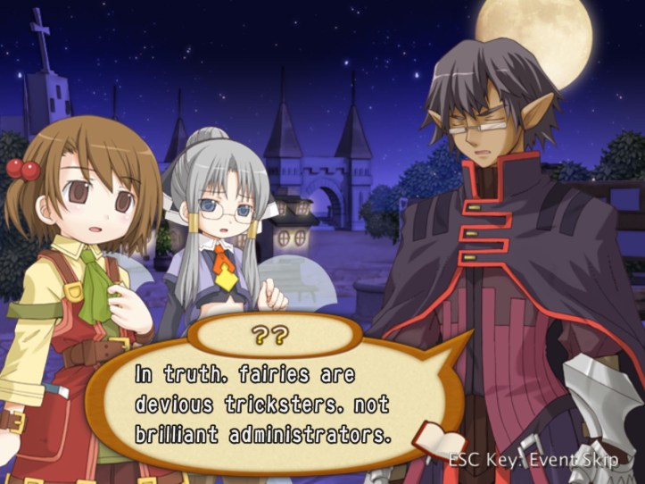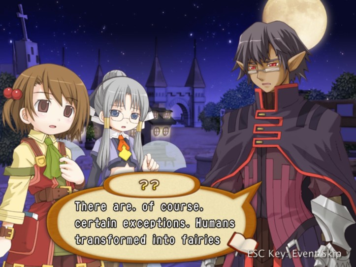 Demon Guy shows up again, ridiculing Tear further for integrating with the humans. I think he sees some sort of kinship in her as a fellow fey species, thinking of humans as below them. You can gather from some of Tear and Tielle’s flavour text elsewhere that the non-human races (so fairies, elves and demons, and probably more besides) don’t really like humans all that much, as a rule.