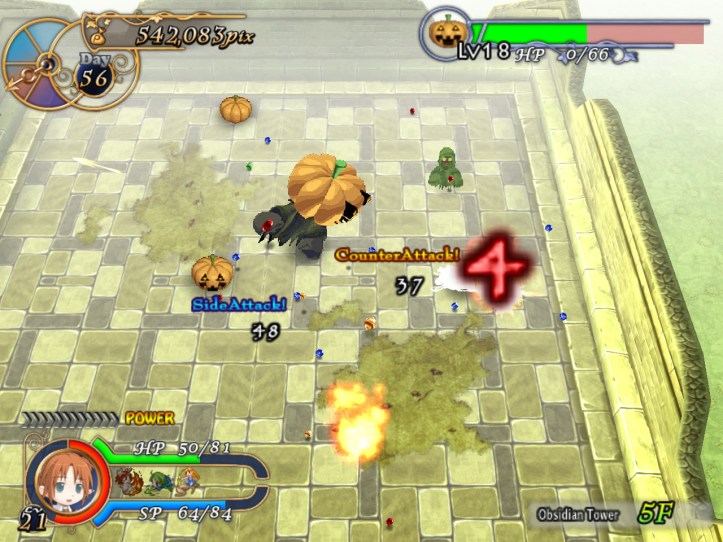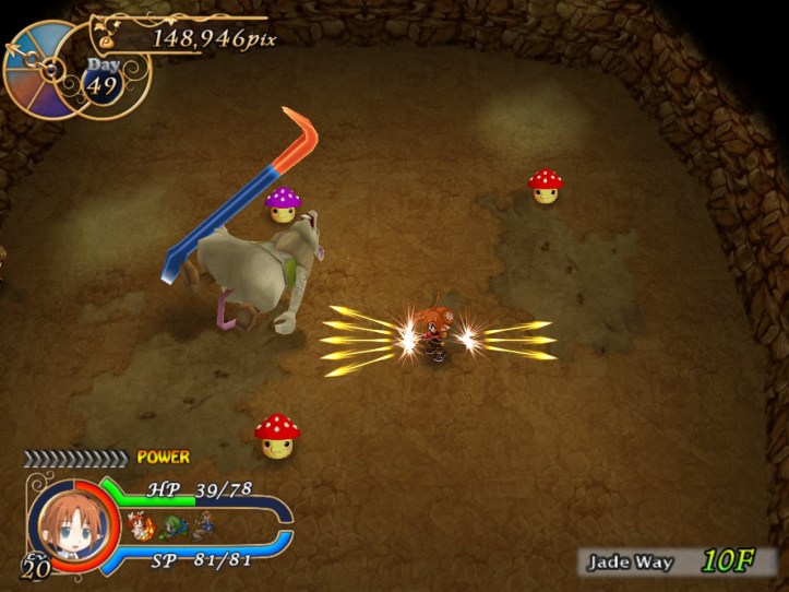 The next ‘boss’ is the ol’ gauntlet, in which I have to defeat every monster on the floor. On the plus side, I don’t know that I could have survived being stuck in a room with a boss; I’m in pretty bad shape. On the… other hand (mixed metaphors, but whatever), it’s fighting regular monsters that put me in this state in the first place!