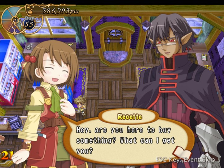 I don’t get this guy’s deal! He’s a dick to Tear about being friendly with humans, but I think his warning to us to get out is meant at least semi-seriously… intriguing. Recette actually convinces him to buy something from us if we’re still around next time he’s in town, so I think he kinda likes us.