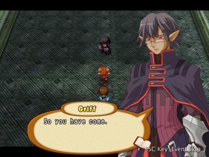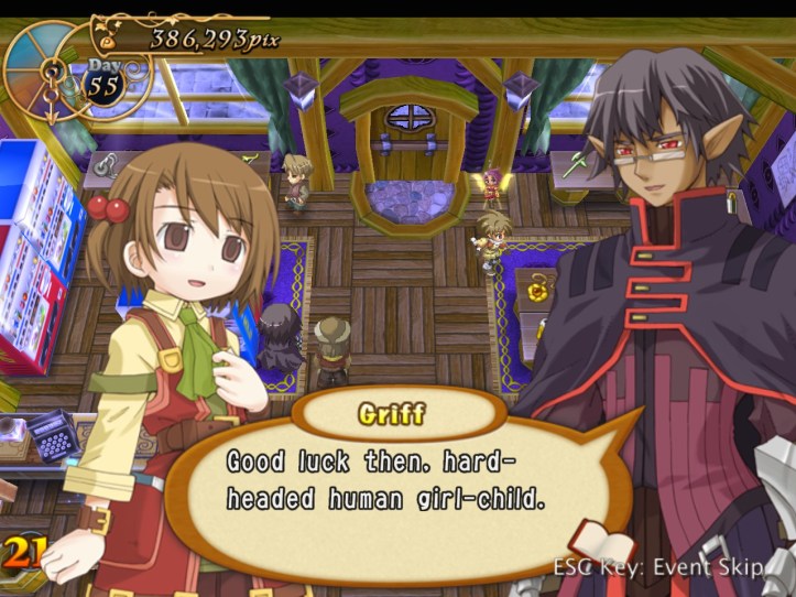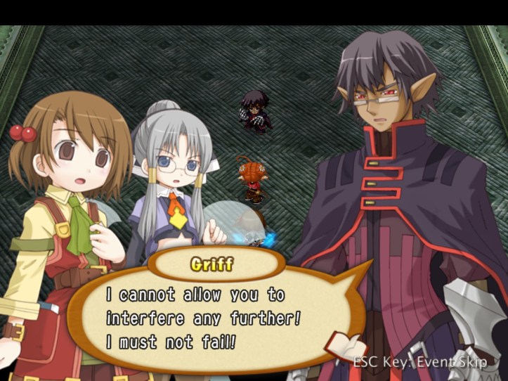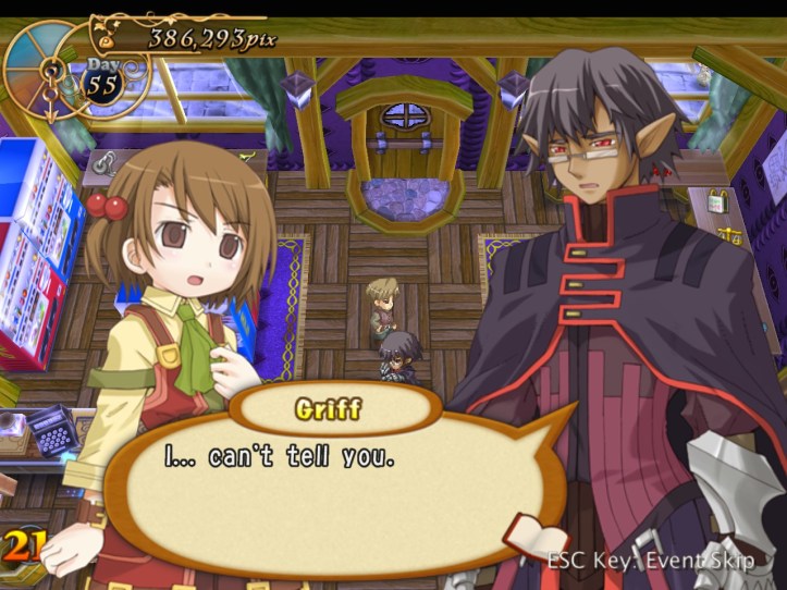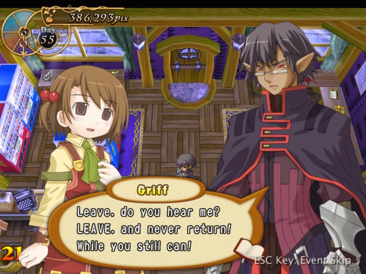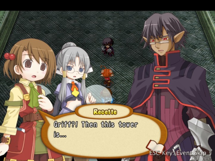 Griff alludes to some sort of powerful magic thingumebob on the top floor, which Tear can sense but Recette can’t (because she’s not magical and has an itchy nose). With that, our demon pal decides it might be time to try killing us. Why he didn’t do it in the town square, where we weren’t functionally invincible, is beyond me.