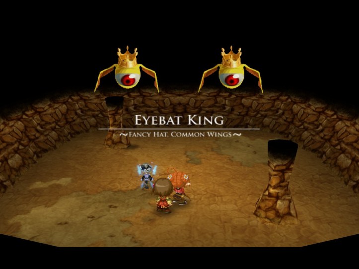 When we come back, we find that the next boss is a double Eyebat King. They are, if anything, even more annoying than a single one; they seem to have double the mooks, and Tielle’s not fast enough to be able to easily avoid their hard-hitting laser eye thingy. I basically have to resort to running around like a madman, firing off special attacks whenever I get the opportunity and hoping that they’ll hit something.