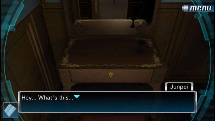 In the room to the right, we pick up a matchbox. Nothing seems super interesting about it right now, but after grabbing it, Junpei starts up a little conversation.