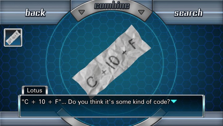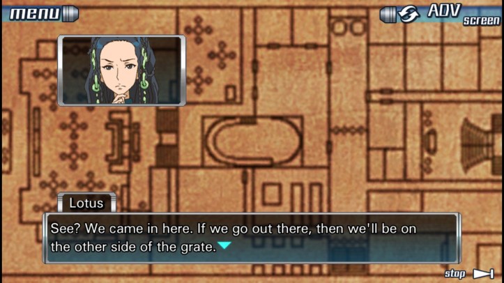 (With her finger Lotus traced a path on the map. She was right. Satisfied that she had been correct, Lotus folded the map and handed it back to Junpei. He took it, and slid the valuable piece of paper back into his pocket.)
