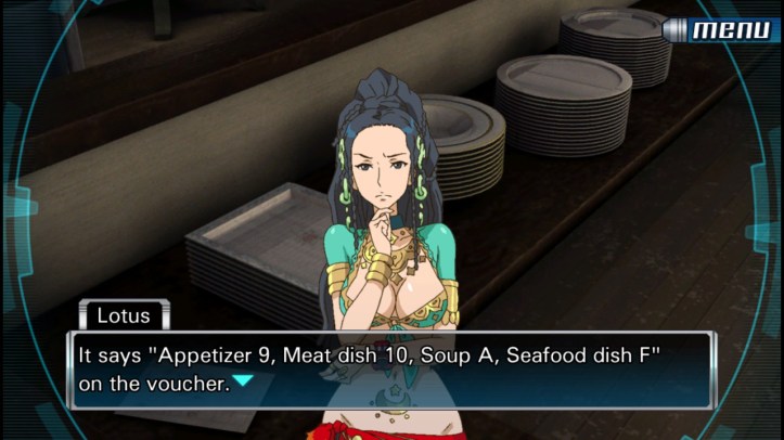 Lotus: It says “Appetizer 9, Meat dish 10, Soup A, Seafood dish F” on the voucher. And the plates on the table are… “9 Appetizer, 16 Meat, 10 Soup, 15 Seafood”. Maybe they’re using [hexadecimal] here.