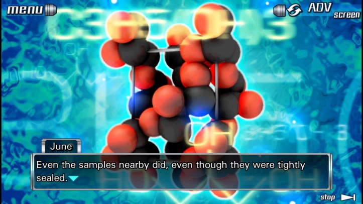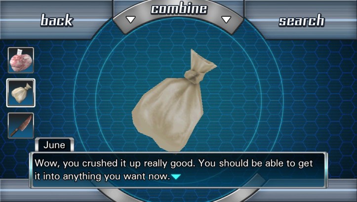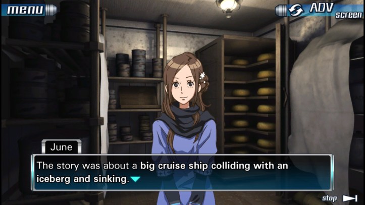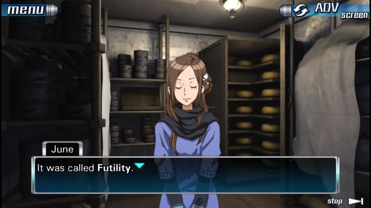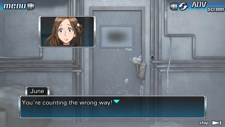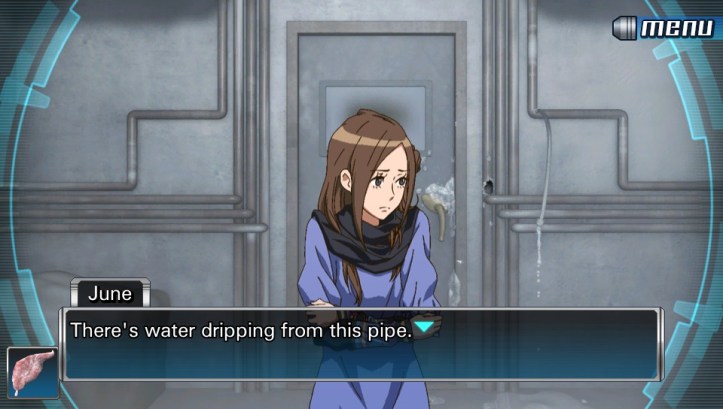 Junpei: All right guys, time to move it. June and I need to look behind you… There’s a little green bottle back there.