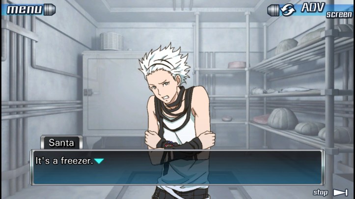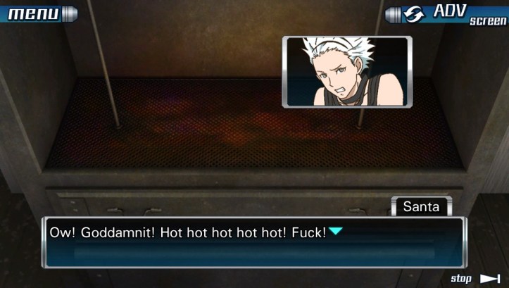 (Santa shoved past Junpei and ran straight to the grill, which he immediately grabbed.)
