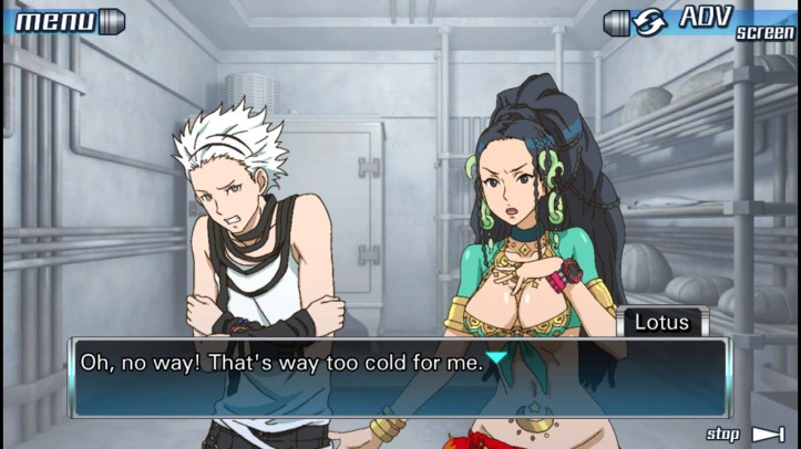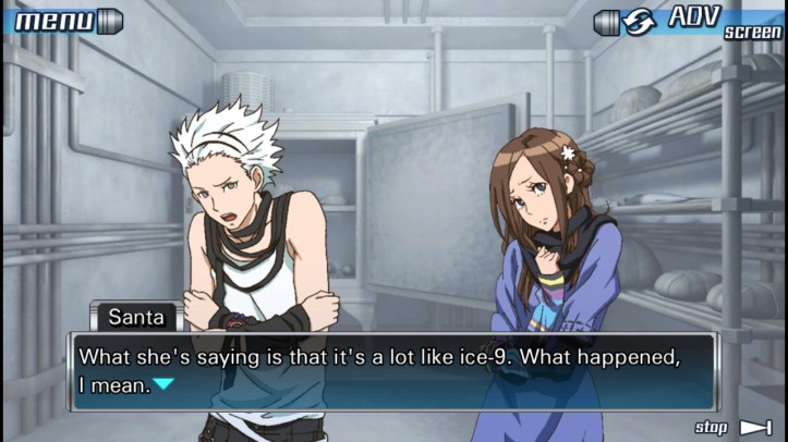 (Junpei grabbed the knob and pushed, with all his might. The door gave way easily, and all 3 of them tumbled out of the freezer at once.)
