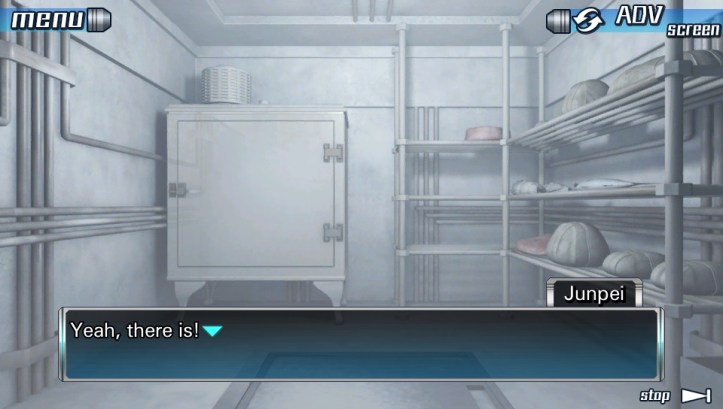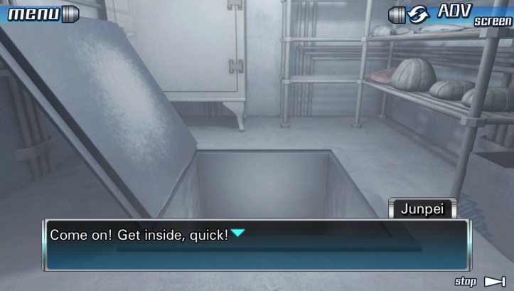 Junpei: Yeah, there is! Look! Right here! We can hide in there!