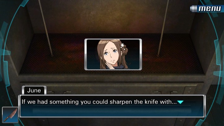 (The knife seemed important, Junpei thought, but it wasn’t going to be much use the way it was.)