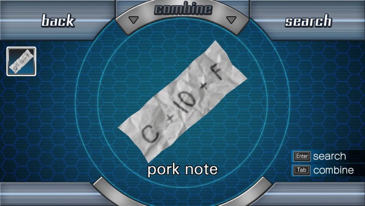 Aaaand we get ‘pork note’, one of my favourite names for an item ever. C + 10 + F, it says. Okay, so C was 12, 10 is 16 and F is 15, which makes… er… 12 + 16 is 28, plus 15 is 43, right? Is that the code, just ’43’?