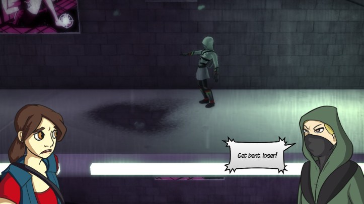 20171001174619_1Progressing through the game, I’m finding more to like about it as it introduces new stuff with each level. After a few successful deliveries, we find ourselves on the turf of Mega Pizza Corp (or something), who have their own pizza ninjas. They can’t directly hurt Gemma, or certainly they can’t kill her, but they can slow her down – and when they do, they’ll laugh cruelly at her until she gets back up. I wouldn’t say the game gets dark, as such – at least not yet – but it certainly starts to introduce a few themes around bullying, depression and other problems in the life of a teenage girl (pizza ninja or no). Gemma’s aunt is apparently getting too old to make the runs, which isn’t a big plot point yet but might turn into a thing, and some of Gemma’s customers are people she knows from school; they’re not always very kind to her, and she isn’t always very kind to them (intentionally or not, her brother does call her out on it).